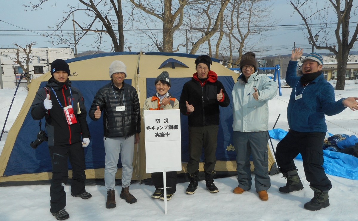 なお、野外冬キャンプは風速15mと強風のため体育館のステージにて疑似体験となりました。室内温度がマイナス0度まで下がる中、参加された4名は冬用シュラフと個別のテントで熟睡できました。次回は野外で本格的な防災冬キャンプを実施したいです。