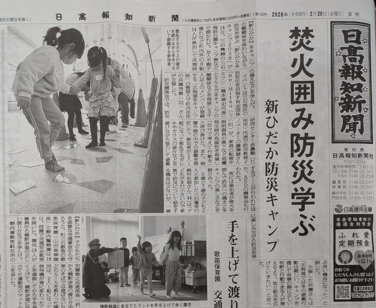2月14日(土)新ひだか町三石蔵三で実施した「新ひだか防災キャンプ」の様子を取材していただきました。赤鼻塾からは「ひなんくんれんゲーム」を実施しました。