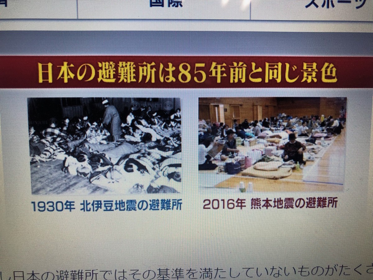 つまり、何も体育館がダメで、テントにしろということではなくて、僕は西洋に学ぶことが必要だと思うのです。現に日本の体育館の避難所は85年前とほとんど変わらずです。日本という国は、幕末時、戦後と西洋に学ぶことで発展遂げてきたのですから。ストレス過多の旧式のやり方にこだわりつづけるのか、それとも西洋式を取り入れていくのか。幕末で例えるなら、攘夷派は旧式の体育館、開国派はテントの避難所を推奨している登山家の野口健さんと北海道では赤鼻塾の藤澤というところです。