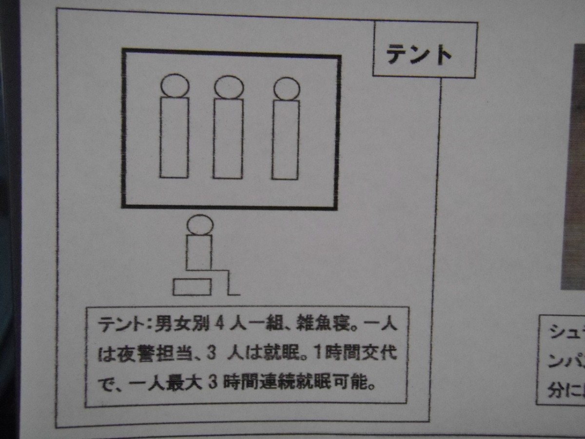 では、どのようにテントを使用するかというと・・・画像の絵を見て頂だくとわかるように、男女別で4人一組のグループを作ります。テント内に3人は就眠(仮眠?)、一人はテントの入り口前で夜警の当番を1時間ずつの交代でします。一人では最大3時間連続して就眠可能になります。