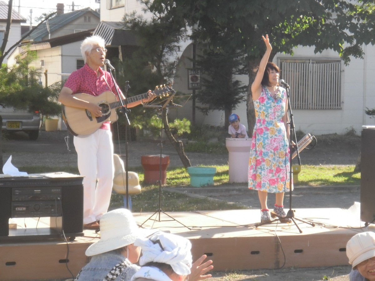 申し訳ないことに、会場が町内会の焼き肉大会でもあり、相当年代物の音響機材を使用、さらに江別特有の強風と強烈な日差しというシチュエーションでの演奏でした。が、100名弱の町内会のみなさんは箸を持つ手を止めて...、お二人の歌唱パフォーマンスに魅了されました!特に後半は盛り上がりましたね。